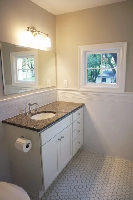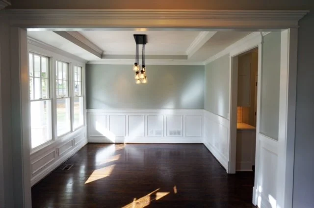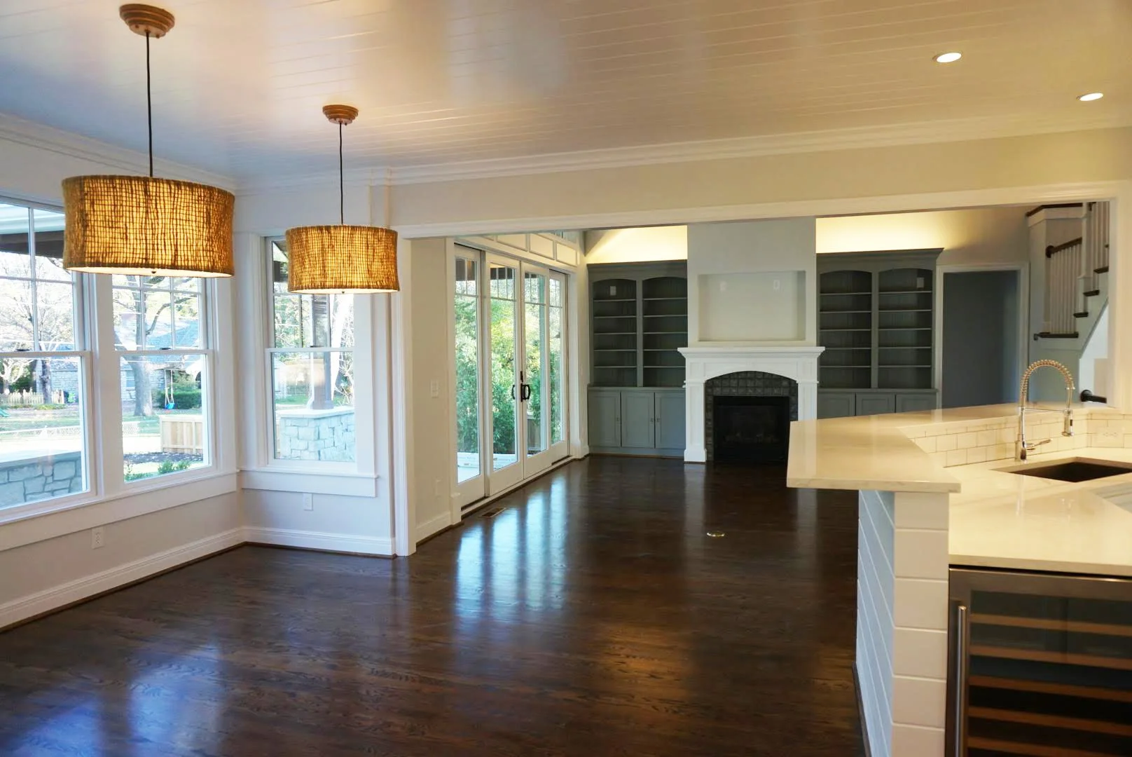 The open-concept living and dining areas boast rich hardwood floors, large windows that flood the space with natural light, and a cozy fireplace. The modern light fixtures and wainscoting detail contribute to the room's chic and inviting atmosphere.