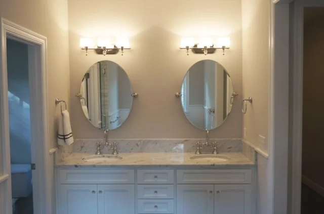 The bathrooms exude luxury with their polished fixtures, marble countertops, and spacious layouts. Dual vanities and large mirrors enhance the sense of space and functionality, creating serene retreats within the home.
