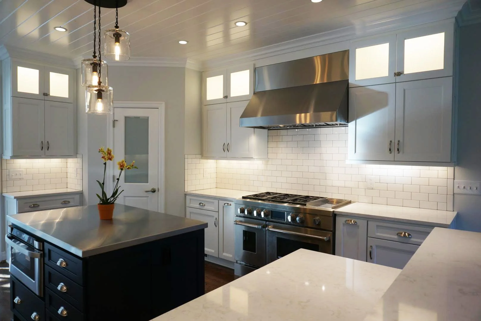 The heart of this home features a contemporary kitchen with sleek stainless steel appliances, a central island, and crisp white cabinetry. The subway tile backsplash and pendant lighting add a sophisticated touch, making this space ideal for both culinary adventures and casual gatherings.